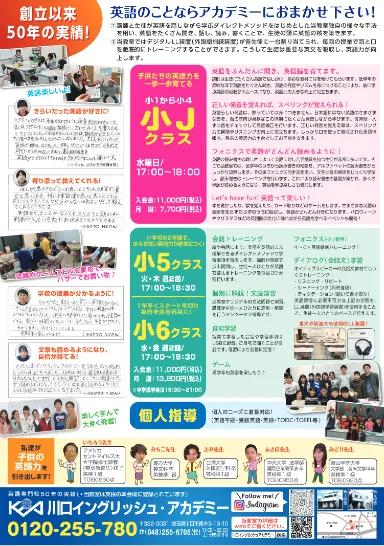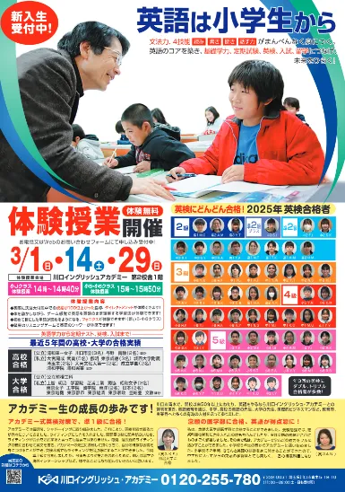 川口イングリッシュアカデミーは小学生から英語のコアを築く英語教室です。英会話はもちろん、読み書きやリスニングなどの英語力養成から、学校の試験・入試、英検まで対応しています。